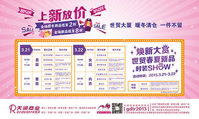 [查看详情]2015年3月21日20:00--21:30世贸大厦将上演春夏新品时装SHOW,梦幻的水晶舞台展示场内力果童装、时尚小鱼、叮当猫、杰米熊等童装品牌。